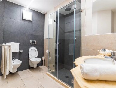 Il primo livello è provvisto di bagno privato con un ampia doccia a cascata, una cucina completamente attrezzata e un divano letto estraibile (due letti singoli).